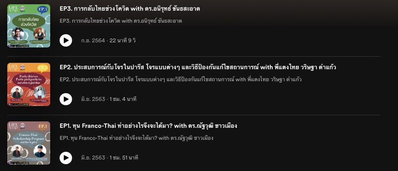 รายการ Life is Pain au Chocolat รายการที่จะพาทุกท่านไปสนทนากับนักเรียนไทยในประเทศฝรั่งเศสรวมไปถึงศิษย์เก่าที่เคยศึกษาที่ประเทศฝรั่งเศส หลากหลายสาขา ในแต่ละตอนเราจะชวนให้แขกรับเชิญของเราแชร์ประสบการณ์การใช้ชีวิต เล่าเกี่ยวกับสิ่งที่ศึกษา และพูดคุยในหัวข้อหลักที่เราหยิบยกมาในแต่ละตอนรายการ Life is Pain au Chocolat นี้ได้รับการสนับสนุนโดยสมาคมนักเรียนไทยในประเทศฝรั่งเศสในพระบรมราชูปถัมภ์